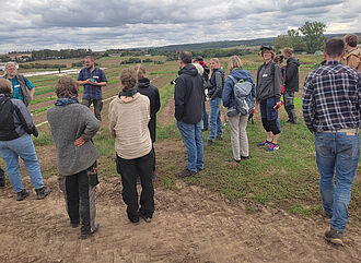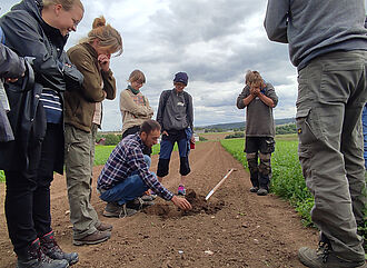 An der Versuchsfläche wurden den Besuchenden die geplanten humusfördernden Maßnahmen erläutert und mit Untersuchungen wie Infiltrationstest und Spatendiagnose die Referenzfläche mit der Maßnahmenfläche verglichen.